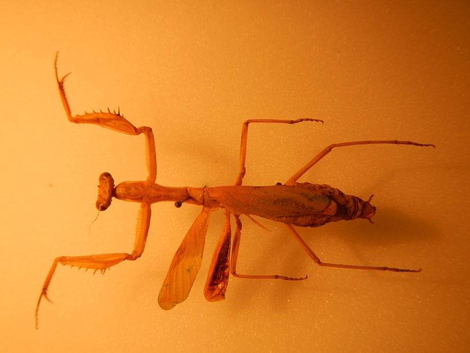 Questa bellissima specie l'ho acquistata a Entomodena per 25 euro, inconfondibile segno della sua rarità! L'Iris polystictica polystictica è una specie della famiglia Tarachodidae distribuita dal Caucaso alla Cina centrale, molto simile alla nostrana iris oratoria, se ne distingue per la distribuzione più orientale e per la placca sotto-genitale femminile più appuntita e non troppo espansa. L'esemplare in foto è una femmina raccolta in Cina da un raccoglitore locale sconosciuto. Da notare la forma del pronoto davvero particolare, con la prozona assai sviluppata rispetto alle altre specie del genere. E' un peccato che le ali membranose siano andate perse, come quelle di iris oratoria sfoggerebbero una sgargiante livrea rossa e nera.