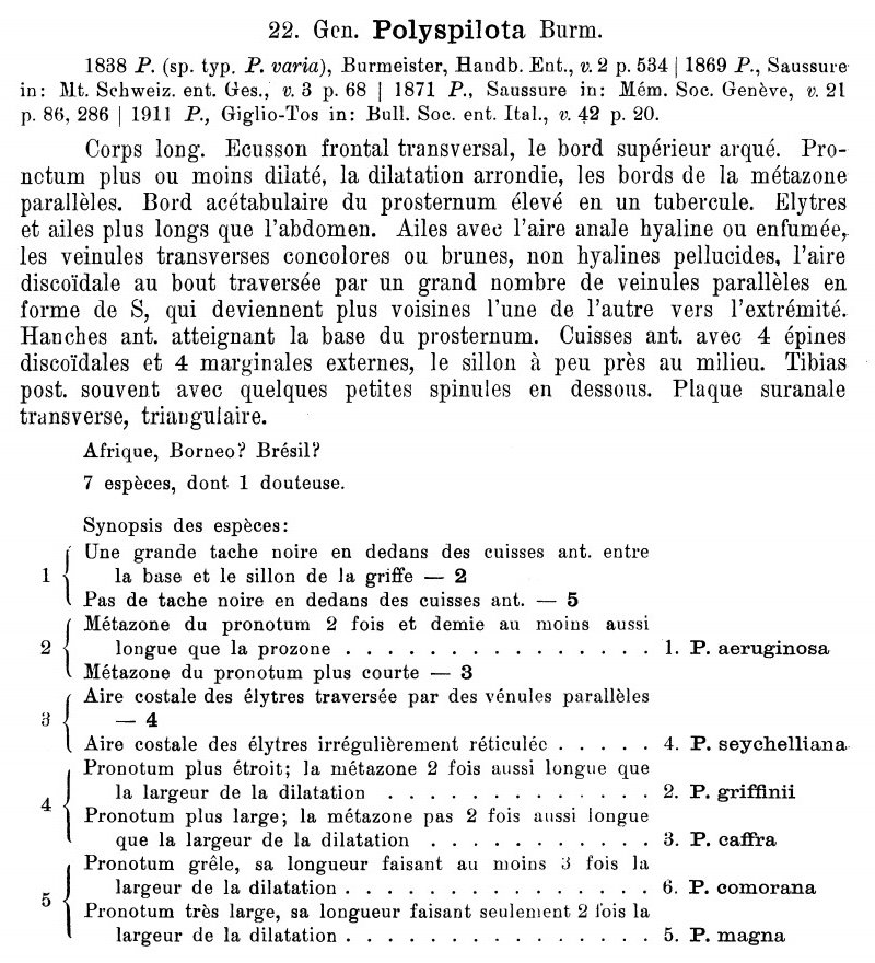 Questa è molto interessante. :D Non ha le bande scure sulle ali, che dovrebbe essere carattere tipico di tutti i Polyspilotini. Tuttavia appartiene quasi sicuramente al genere Polyspilota. Non è la seychelliana, dato che mostra macchia nella faccia interna dei femori meno marcate, e non è nemmeno aeruginosa o voeltzkowiana dato che mostrano le caratteristiche bande alari. Se ci fossero dei maschi si capirebbe subito di che si tratta :)