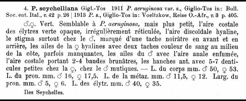 :no: La P. seychelliana ha comunque la macchia sfumata nel margine. Questa inoltre ha le ali ialine, mentre, come è scritto nel lavoro di Giglio-Tos, la seychelliana ha ali irregolarmente reticolate nell'area costale e quelle posteriori non sono ialine (come in P. aeruginosa). Purtroppo però non so che specie sia, forse la voletzkowiana . ;)