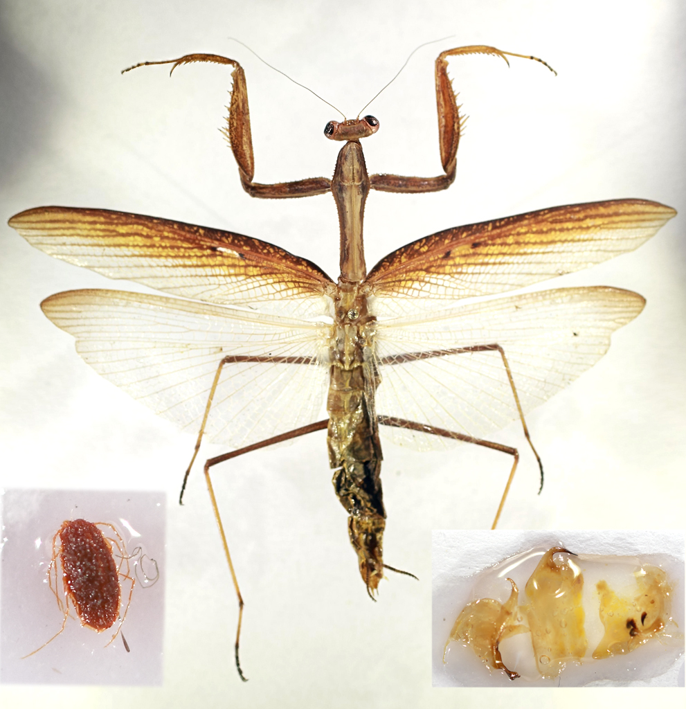 E' solo un'ipotesi. In realtà potrebbe essere anche una specie di Charletonia (stessa famiglia) o qualcos'altro. Ad esempio, ci sono almeno due specie di Charletonia in sud Europa, le cui larve parassitano Mantis religiosa. Comunque entrambi i generi sono diffusi in Centro Africa e sono associati anche a ortotteri. Bisognerebbe vedere la forma dei cheliceri, ma la mia è solo curiosità.