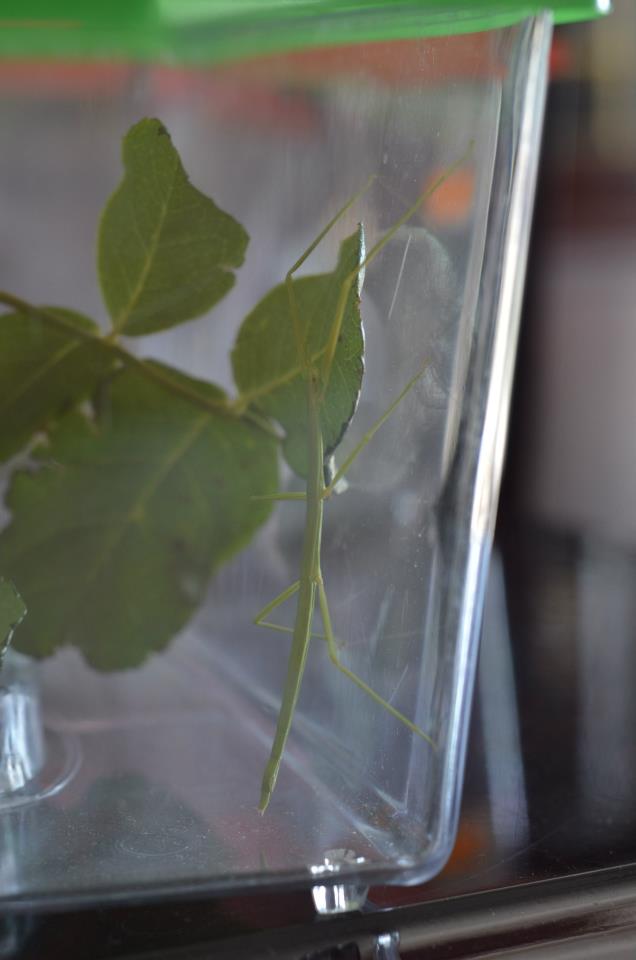 Ora i "piccoli" sono di 5 cm (testa-coda...8-9 cm se misurati con le anteriori tese), mangiano rose, rovi etc e ogni tanto nebulizzo un po' d'acqua in modo che le gocce si depositino sulle foglie e gli stecchi possano bere se assetati dalle giornate troppo calde. I colori sono vari, ne ho di verdi, di marroni, di rossicci-verdi, ma sono tutte femmine.