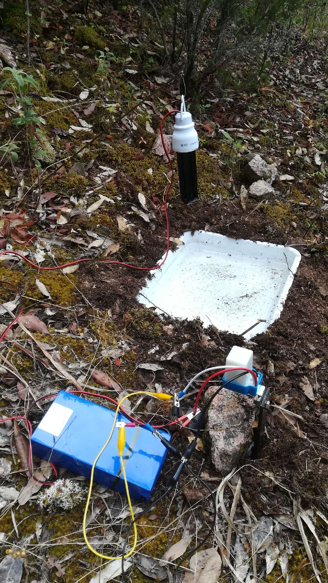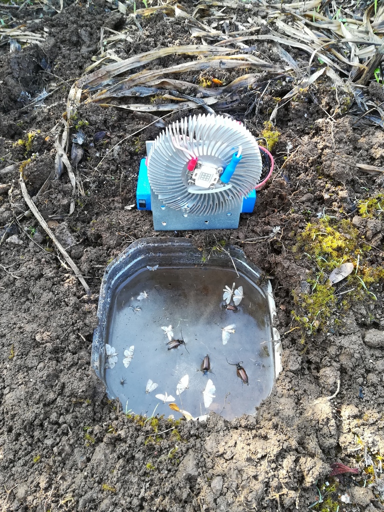 Stamattina ero sul campo per allestire qualche trappola luminosa con interruttore crepuscolare e ho fatto alcune foto. Il metodo è quello già illustrato: bacinella molto bassa interrata a filo di terra con un dito di acqua saponata; lampadina uv a fluorescenza da 20W sospesa con una bacchetta metallica infissa obliqua al suolo; batteria da 20000 mAh collegata al crepuscolare e alla lampadina.