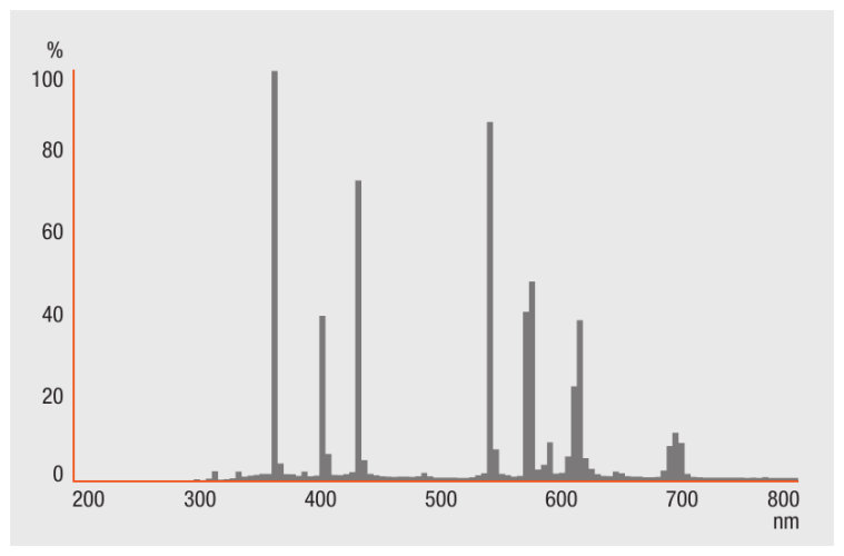 Per quanto riguarda i lepidotteri, credo che i risultati migliori si ottengano, per il momento, con le lampade al mercurio HQL, quelle senza il filamento all'interno che quindi hanno bisogno del reattore esterno; ora, e limitandosi appunto ai lepidotteri, perché non cercare di simulare semplicemente, usando i led, lo spettro delle HQL, che è questo?: