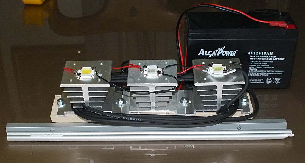 Come dicevo, erano necessarie altre prove. Venerdì ho completato i collegamenti tra i tre led 12V da 10W e la nuova batteria al piombo 12V 10Ah. La prova delle foto precedenti l'avevo fatta con la batteria collegata con dei fili rimediati provvisori.