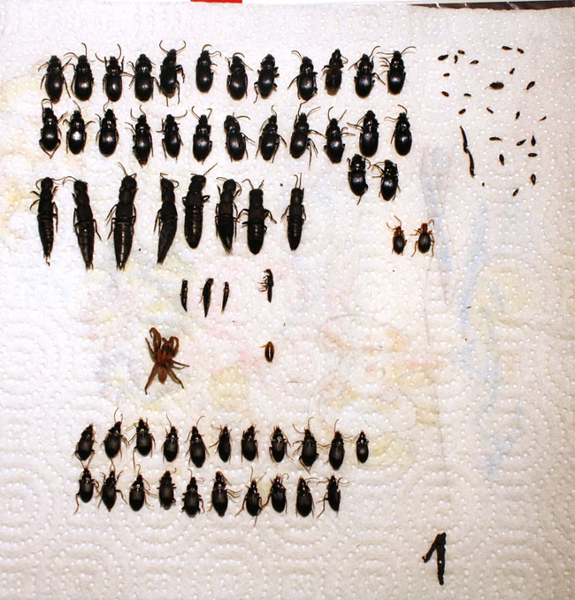anche qui la raccolta è stata abbondante (meno della prima ma qui ho messo solo 2 trappole) la varietà di specie di grossi carabidae è stato maggiore, mentre i microcoleotteri sono stati inferiori