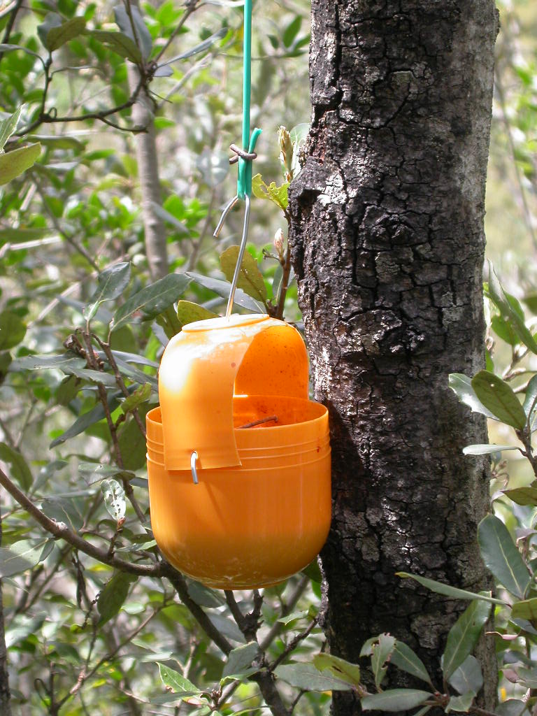 Le altre invece sono state ricavate da bottiglie di plastica di bibita. Questa è stata piazzata in bosco d’alto fusto, ai margini di un ‘buco’ tra le fronde: è a circa 25 metri di altezza. L’ho messa lassù grazie a una fionda che ha lanciato un sasso legato a del nylon da pesca: il nylon poi è stato sostituito con del comune spago da pacchi. La trappola può essere tirata giù e issata nuovamente grazie allo spago.