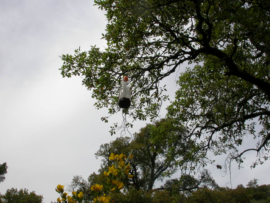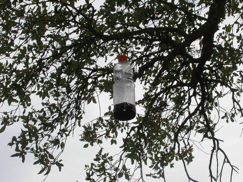 Ieri ho ritirato cinque trappole aeree a liquido, innescate a semplice vino rosso con una lieve aggiunta di sale. La stagione, almeno qui in Sardegna, è già idonea per il loro impiego. Alcune foto delle trappole, diverse per posizionamento e dimensioni: la prima è questa, ricavata dall'involucro di sorpresa di un uovo di Pasqua. E’ di piccole dimensioni ed è stata posta nel tronco di un leccio che stillava linfa e che quindi costituiva già di per sé una attrattiva per diversi insetti.