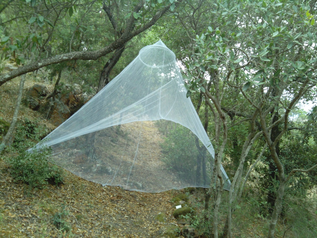 Ho pensato che una cosa del genere, se posizionata in orizzontale lungo un sentiero, invece che in verticale su un letto, potesse diventare una discreta trappola per gli insetti volanti. Tenendo il vertice sollevato, e applicandovi un contenitore con un raccordo ad L, potrebbe funzionare come una vera Malaise, per Imenotteri, Ditteri, ecc., ovvero insetti che cercano di superare l'ostacolo volando più in alto. Posta col vertice in basso, ed un contenitore pieno d'acqua sul fondo, potrebbe catturare insetti che incontrando un ostacolo tendono a scendere a terra, in particolare, Coleotteri.