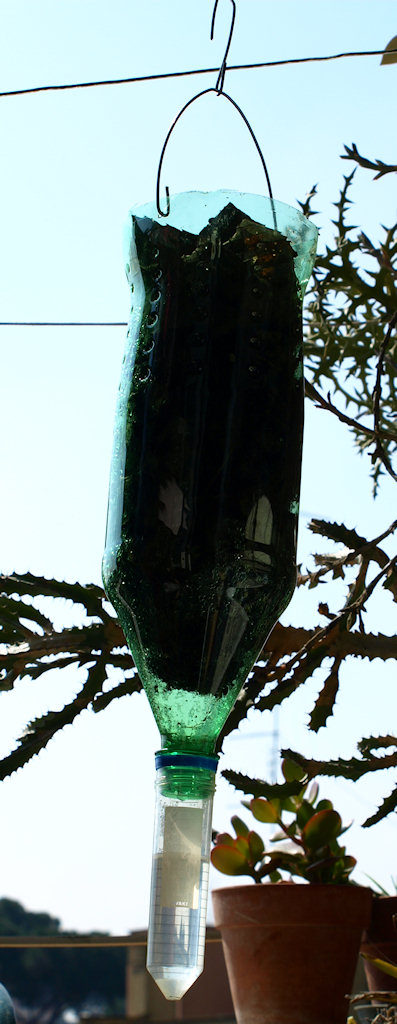Poi, nei giorni successivi, li controllo, quando trovo il tempo, sbatacchiandoli su un vassoio bianco. Recentemente ho affinato la tecnica e, dopo l primo controlo a vista, butto tutto il materiale grossolano (i muschi dopo averli sbatacchiati ben bene) e metto il resto in una bottiglia di plastica (vanno benissimo quelle da 2 litri di Coca Cola o Pepsi Cola) a cui taglio il fondo, ci fisso una specie di manico in fil di ferro con un gancetto che uso per appendere la bottiglia rovesciata al filo per stendere i panni sul balcone. AL posto del tappo ci avvito una provetta di quelle da analisi (quelle col tappo di plastica a vite e la base conica, per intenderci), che ha giusto le dimensioni del tappo della bottiglia, con dentro un po' di acqua e sale (ed una traccia di sapone). E aspetto che il tempo ed il sole facciano il resto. Insomma, un Berlese fatto in casa a costo zero.