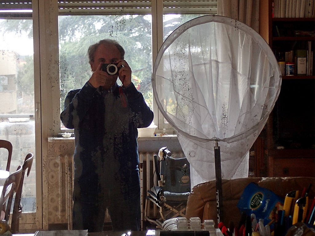 Questo è il retino che ho intenzione di usare (fotografato allo specchio, per far vedere le dimensioni rispetto a me. Le macchie che si vedono sono sullo specchio, che è vecchiotto)