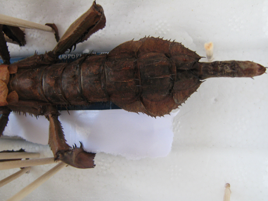 ho preparato ieri una femmina di Exatosoma tiaratum; non avendo dimestichezza nella preparazione di insetti, e non disponendo nemmeno di strumenti idonei, mi sono arrangiato come potevo, tenendo in posa l'insetto con degli stuzzicadenti. Ora vi chiedo: che tipo di spilli debbo comperare per fissare l'esemplare al supporto, una volta essiccato? Avrei dovuto infilzare l'esemplare già ieri? Quali sono le convenzioni per la disposizione degli spilli su grossi fasmidi?