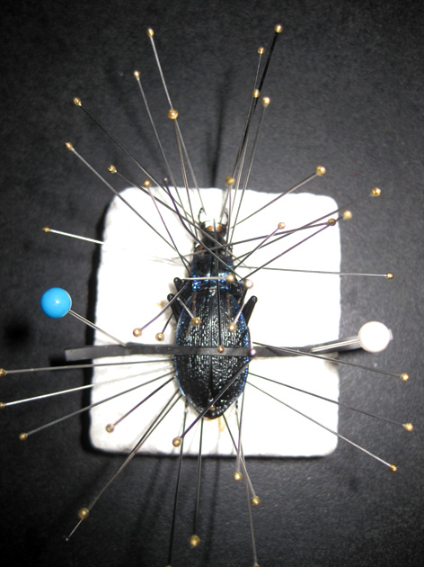 potresti anche prepararli su del polistirolo, tenendo fermo l'insetto con un pezzetto di gomma sottile (io uso la camera d'aria delle gomme da bicicletta, tagliando delle striscioline esili e non ingombranti), tenuta in tensione da 2 spilli...in questo caso potresti mettere tutti gli spilli che vuoi per posizionare zampe ed antenne; quando l'insetto sarà secco con cautela lo incollerai sul cartellino.