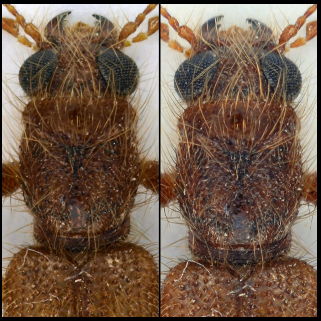 Stasera ho fatto qualche prova, montando prima l'Olympus E-410, poi la Nikon D200, sullo stesso soffietto e con lo stesso obiettivo (un 80mm f/4 El-Nikkor da ingranditore, con attacco Leica M39). Stessa illuminazione con 4 faretti da 60 led ciascuno, color bianco puro (circa 6000°K). Stesso diffusore a cupola di media densità (fatto con la sommità di una bottiglia di plastica di alcool denaturato). Per ottenere circa lo stesso fattore di ingrandimento ho dovuto cambiare l'estensione del soffietto, più allungato con la Nikon, rispetto alla Olympus. Il risultato è quasi alla stessa scala (per una mia imprecisione, l'immagine ottenuta con la Nikon è leggermente più ingrandita). Entrambe le foto, di cui metto una miniatura, erano in origine a 10 Mpixel. A sinistra la foto con l'Olympus, a destra quella con la Nikon: Questo è un crop a dimensioni reali della testa e protorace, a sinistra la foto con l'Olympus, a destra quella con la Nikon: E questo è un crop della parte posteriore delle elitre, sopra Olympus, sotto Nikon: Nelle miniature ho aggiustato un po' la nitidezza dopo il ridimensionamento. Nei due particolari non sono state fatte modifiche ad eccezione del bilanciamento del bianco (è stato necessario correggerlo di più per la Nikon). A me pare che, a parte una certa differenza di colore, dovuta probabilmente al diverso funzionamento del sistema di bilanciamento del bianco, ma facilmente correggibile in post-produzione, non ci siano differenze sostanziali, eccetto forse una nitidezza leggermente superiore nella Nikon. Da notare che i due modelli sono entrambi fuori produzione e sono usciti più o meno nello stesso periodo (2005 la Nikon, circa un anno e mezzo dopo la Olympus), ma uno, l'Olympus E-410, rappresentava l'entry level della gamma Olympus, e costava allora circa 400 Euro con l'obiettivo 14-40, mentre la D200 era una macchina di fascia alta, di prezzo almeno quadruplo per il solo corpo macchina. Consideriamo poi le dimensioni e il peso delle due macchine, che sono sensibilmente diverse (tenendo anche conto che nella più piccola E-410 trova posto pure un sistema di pulizia del sensore, che non c'è nella D200, e l'alloggiamento per due schede di memoria in contemporanea, una Compact Flash ed una XD, mentre nella D200 ci va solo una Compact Flash): Ovviamente, la D200 è molto più solida e impugnabile della E-410, ma non si può avere tutto!