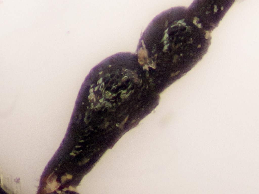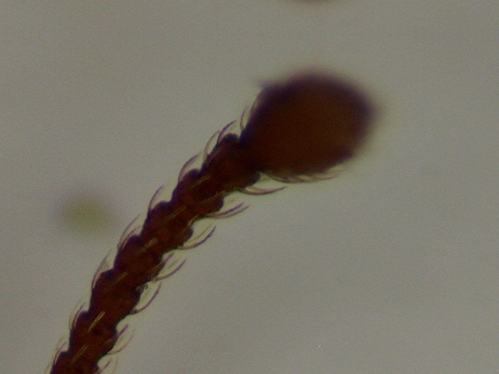Altra prova. Ho fotografato lo stesso insetto della prova precedente sostituendo il Nikon 10x col Leitz BEL 6x/0.20, teoricamente molto inferiore. L'immagine risulta meno dettagliata, però non c'è traccia delle bande viola e verdi! Metto solo un particolare dell'antenna, ma in tutto il resto dell'insetto non si notano comunque queste bande colorate. Che ci sia una qualche strana incompatibilità tra l'obiettivo Nikon E-Plan 10x e la mia fotocamera?