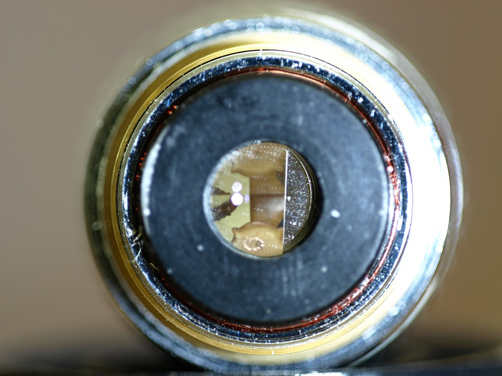 Rieccomi qua! Ho fatto una prova fotografando la testa di un Latridiidae e vi metto i ritagli a grandezza originale delle due antenne, fatte con la Canon Kiss X4 e con la Olympus E-410. L'ingrandimento è un po' diverso perchè i sensori sono di dimensioni diverse e con numero diverso di pixel, ma obiettivo, allungamento del soffietto e illuminazione sono gli stessi. Sensibilità ISO 200 su entrambe (da notare che a parità di tutto, la Canon fa foto più chiare ma la Olympus ha un bilanciamento del bianco automatico migliore). Con la Canon ho scattato dal pc, con l'Olympus con doppio ritardo (autoscatto 2 sec. + ritardo sullo specchio di altri 2 sec.). Antenna destra (completamente a fuoco) Canon Olympus Antenna sinistra, con la clava sfocata (ho fatto pochi scatti) Canon Olympus In conclusione, le bande viola sono presenti allo stesso modo con entrambe le reflex (anche se il diverso ingrandimento e la diversa luminosità possono farle notare di più o di meno. In entrambe le foto si nota però che le bande viola (e quelle verdastre, meno visibili) sono meno evidenti che nelle foto precedenti, e si nota anche un'altra differenza: nella antenna sinistra l'effetto è quasi insesistente, nella destra si nota molto di più, non solo nella parte sfocata, ma anche negli articoli a fuoco (i peli in alto sono più violacei, quelli in basso più verdastri). La spiegazione credo di averla trovata poco prima di fare queste foto. Per farvi capire, ecco due foto dell'obiettivo Nikon E-Plan 10x/0,25 LWD, entrambe del lato da cui si avvita, con luce diversa: Su un lato c'è un settore della lente che ha proprietà ottiche nettamente diverse dal resto. A seconda della luce sembra opaca o riflettente. Sicuramente non fa passare la luce come il resto della lente. Non so se si tratta di una struttura studiata per qualche uso particolare dell'obiettivo o se si è spostato qualcosa, o se è un distacco di una delle pellicole di rivestimento delle lenti (anti-riflesso, ecc.), ma il fatto è che nelle prime foto che avevo fatto era messa trasversalmente al fotogramma. Per queste ultime due ho montato la macchina in verticale, ovvero girata di 90° rispetto a prima, lasciando l'obiettivo come era, e c'è stato un netto miglioramento. Sarà questo il problema?