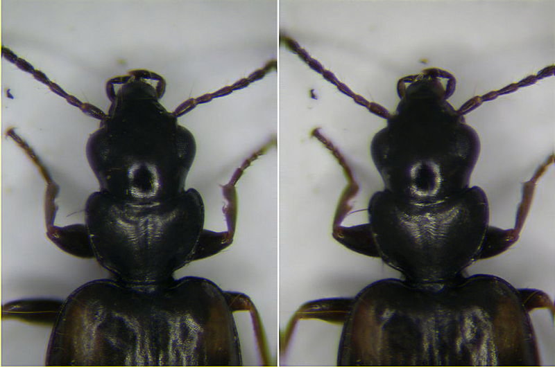 In queste foto di un piccolo Carabidae, fatte attraverso un Leica MZ6 al massimo ingrandimento e una Nikon Coolpix 4500 fissata prima su un tubo portaoculare e poi sull'altro, si vede cio' che vedrebbero i nostri occhi nei due oculari, destro e sinistro.