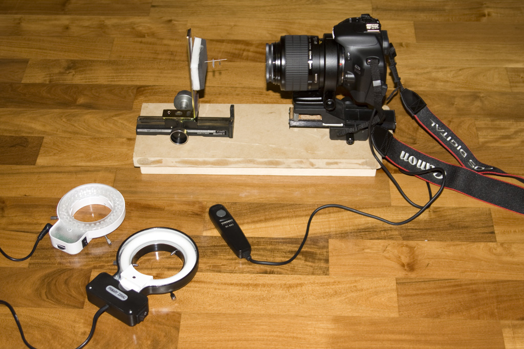 Nel set ho posizionato il sistema fotocamera|obiettivo su una staffa micrometrica (proprio come questa, che fra l'altro sono in realtà 2 staffe indipendenti) e l'esemplare su una seconda staffa regolabile (nel mio caso l'ho ricavata da un vecchio soffietto):