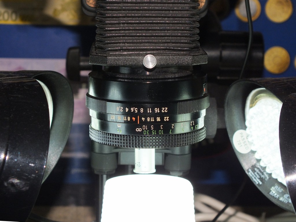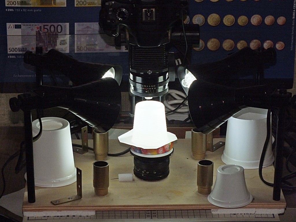 Avendo l'attacco a vite, si può fissare direttamente su tubi o soffietti con questo tipo di attacco, oppure con un adattatore su componenti con innesto a baionetta. In questa foto si vede la distanza di lavoro per un ingrandimento di 2x (campo inquadrato di 11 mm con una Canon 550D), che pur non essendo elevata permette comunque l'uso di un bicchierino per schermare la luce.