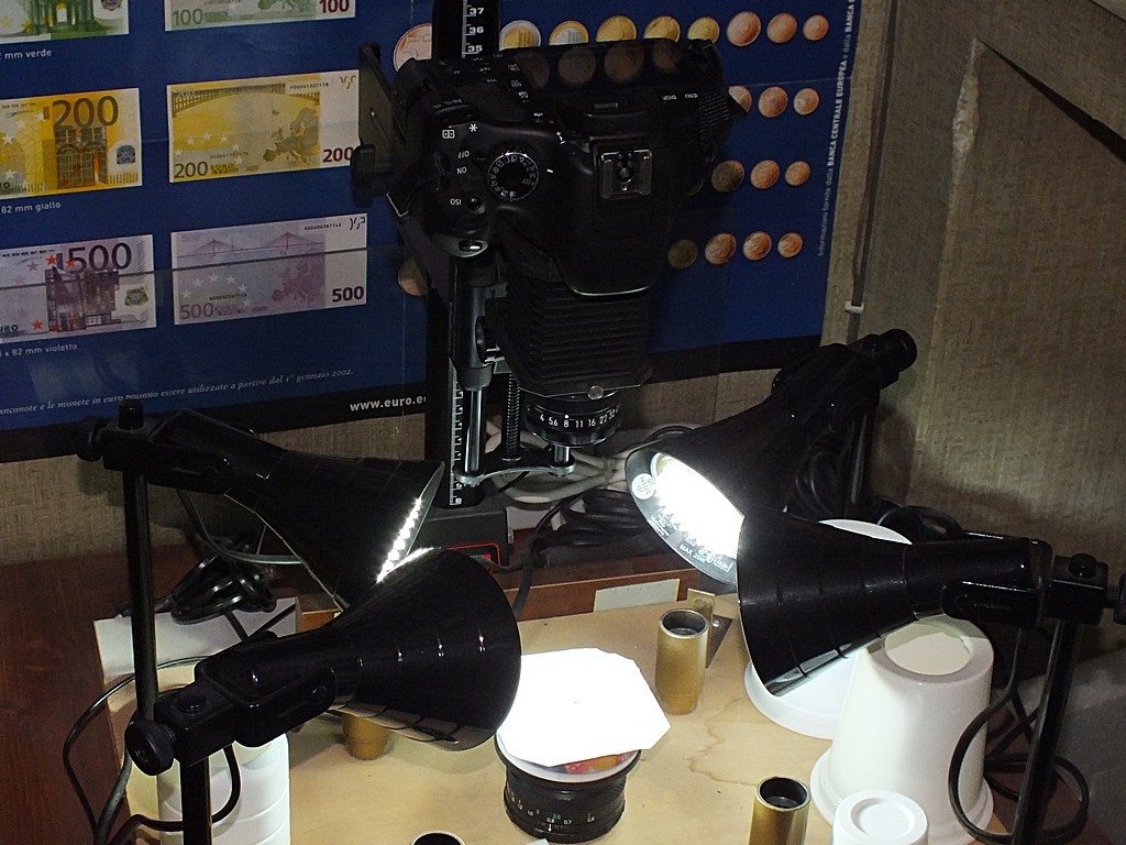 Ingrandisce di più perchè allontanando allo stesso modo dal sensore due obiettivi di focale diversa, quello di focale minore mette a fuoco molto più vicino, ottenendo, malgrado tutto, un ingrandimento maggiore. Finchè non si supera il massimo allungamento del soffietto io preferisco una focale più lunga (senza eccedere, altrimenti le vibrazioni diventano più visibili), perchè posso illuminare meglio il soggetto. Ma se si vuole un ingrandimento maggiore bisogna usare focali più corte, altrimenti ci vorrebbe un soffietto lunghissimo (e comunque l'obiettivo lavorerebbe troppo lontano dal suo campo di utlizzazione ottimale). Con obiettivi a focale corta si arriva a ingrandimenti paragonabili a quelli con obiettivi da microscopio. Il mio obiettivo da ingranditore a focale più corta è un Tomioka Tominon da 17 mm. Ingrandimento mostruoso anche col soffietto chiuso, ma i risultati sono migliori con obiettivo da microscopio. Un buon valore per andare un po' oltre il 50 mm è un obiettivo da 28 - 35 mm, magari montato invertito.