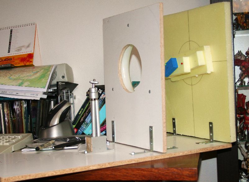 Questo mini cavalletto è stato poi utilizzato come colonna portante per una specie di stativo orrizzontale che ha costruito mio padre. L'idea è davvero semplice: macchina fotografica fissata in un punto, illuminazione adeguata e piano di appoggio per la bestiola da inquadrare....ed il gioco è fatto.