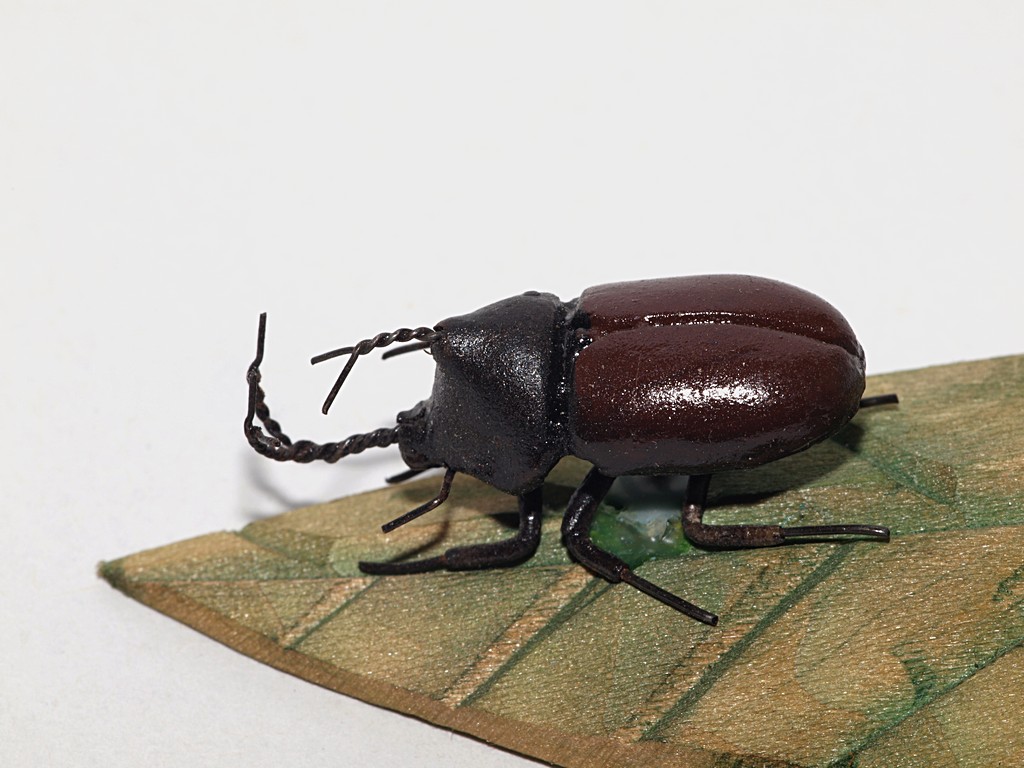 L'Allomyrina dichotoma è realizzata in legno e fili elettrici, in dimensioni ridotte a meno della metà di quelle reali.