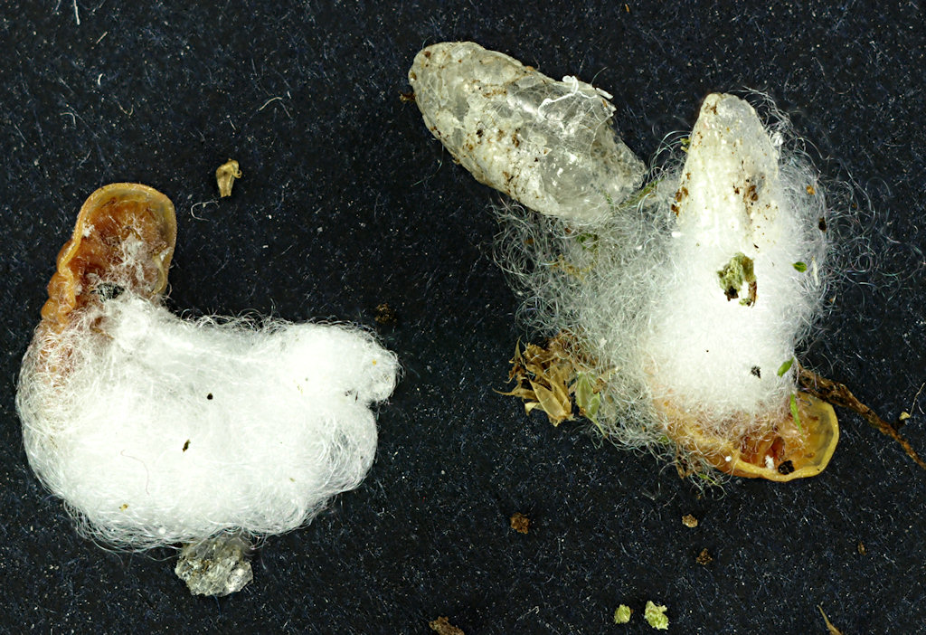 Visti al microscopio, ovviamente, si vede che sono pupe, o larve mature. La cosa più strana è che sono dotati di una consistenza assurda per una creaturina di quelle dimensioni (6-7 mm). visto che quando li avevo trovati, scambiandoli per piccoli bulbi o semi, avevo provato a schiacciarli per tastarne la resistenza, ed avevano resistito!