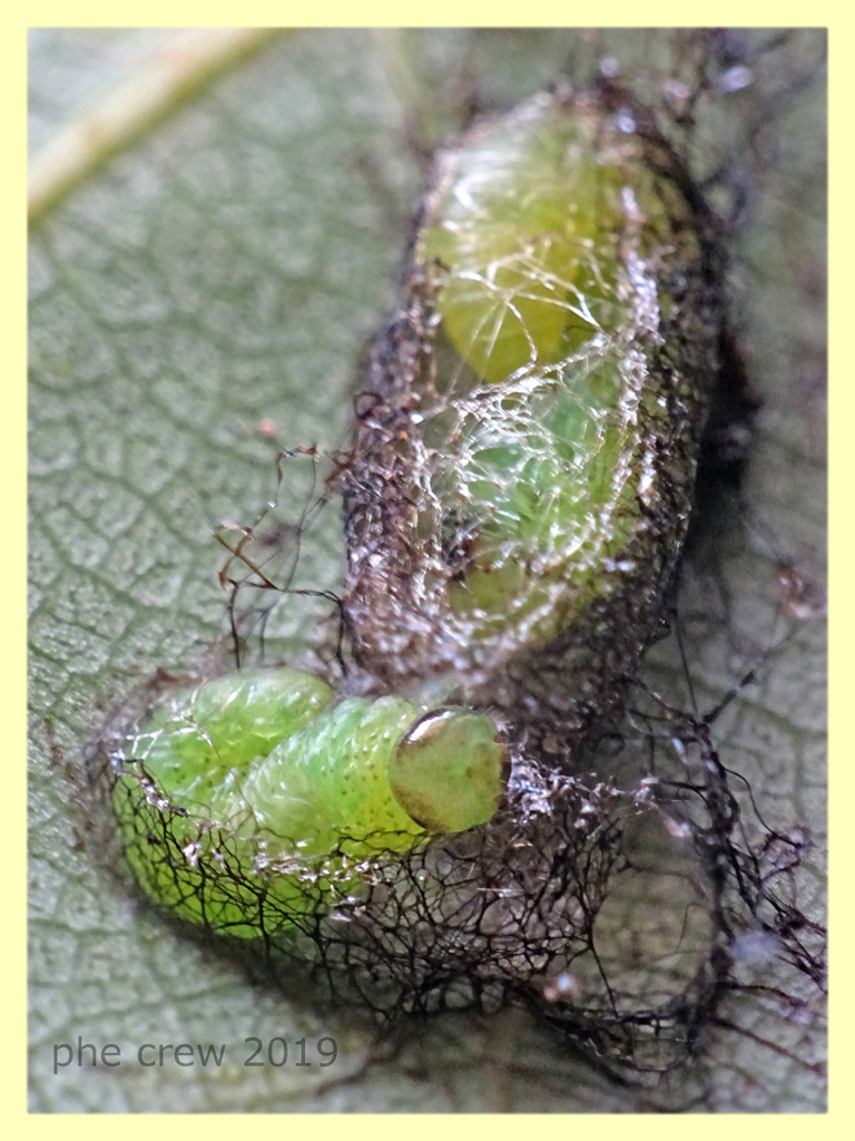 ...nel 2019 trovai 3 larve di Imenottero che smangiucchiavano foglie di Populus e decisi di allevarle. Ne uscirono delle Pristiphora credo...un maschio e due femmine. Larve di circa 6 mm. che si alimentano con foglie di Pioppo. 19.6.2019 Una volta creati i bozzoli, per curiosità, decisi di aprirli e mi accorsi che le larve erano ancora belle vispe. Hanno subito ricominciato a filare per chiudersi di nuovo all' interno. 23.6.2019