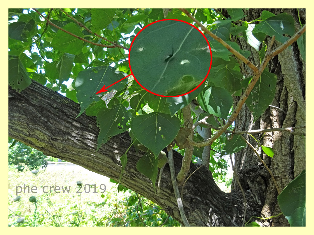 ...queste sono le due femmine. Quella viva circa 5 mm. corpo e quella sfarfallata male che poi è morta 4 mm. Entrambe l' 8.7.2019. ...infine la pianta ospite: un Populus. Solo dopo ingrandendo le brutte foto mi sono accorto che tra le foglie gironzolava già un individuo maschio.