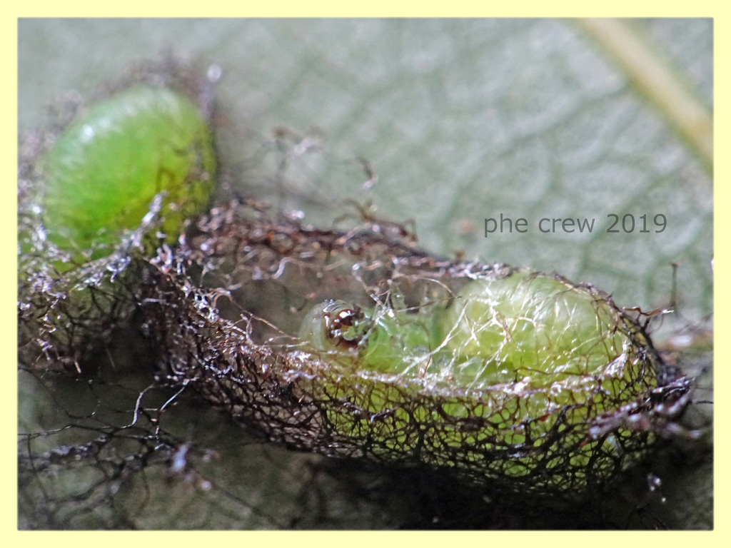 ....dopo circa 10 min. hanno finito di filare e si sono imbozzolati. 23.6.2019 ... successivamente sono sfarfallati in due giorni diversi, la prima foto ritrae il foro d'uscita del 2.7.2019, la seconda l' 8.7.2019 ... questo è il primo individuo lungo circa 5,5 mm corpo e dalle antenne sembra un maschio. 2.7.2019