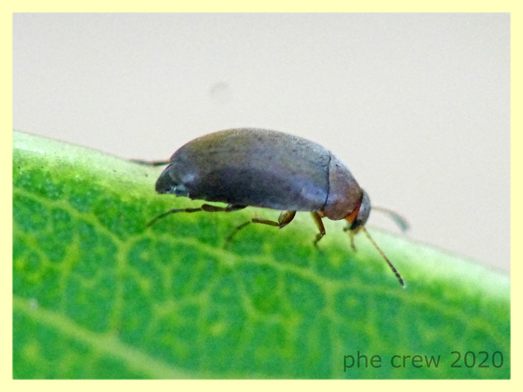... questo piccolo Coleottero che misura 1,8 mm l'ho trovato su di una foglia di Eucalipto con la testa infilata nel bozzolo delle uova di una Psilla...mentre se le smangiucchiava (nelle prima foto la parte più scura nel cerchio rosso)....poi si è allontanato quando mi sono avvicinato. Sembra un incrocio tra un Mordellidae ed una Blatta....boh. Poi se si guardano bene le elitre sono striate in orizzontale.