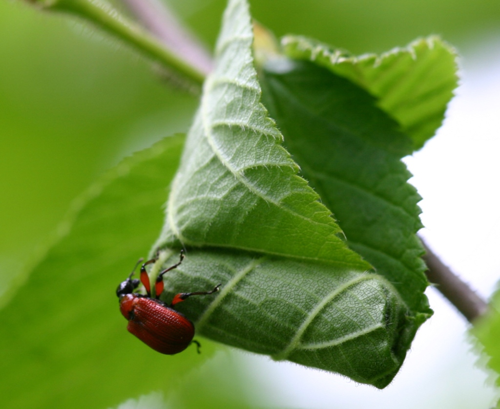 Ho segnalato qui la prima comparsa nella mia zona, alcuni giorni fa, degli adulti di Apoderus coryli (Linnaeus, 1758). Si tratta di una delle specie di Attelabidae più frequenti e, come spero di riuscire a mostrarvi, più interessanti della nostra fauna. Nel seguito vi proporrò mie immagine riprese in diverse situazioni e località, disposte in sequenza per illustrare soprattutto le peculiari modalità di confezionamento del "barilotto", "sigaro" o come lo vogliamo chiamare. Gli anglosassoni lo definiscono leaf-roll o solo roll. Grandi ha parlato (un po' pomposamente) di "nido pedotrofico". La specie in questione ha un areale vastissimo, dall'Europa occidentale al Giappone. In Italia è piuttosto frequente al nord, poi sempre meno scendendo verso il sud. In Molise non è mai stato segnalato (ma ovviamente basterebbe cercarlo nei posti e tempi opportuni), raro in altre regioni, assente (pare) in Sicilia e Sardegna.