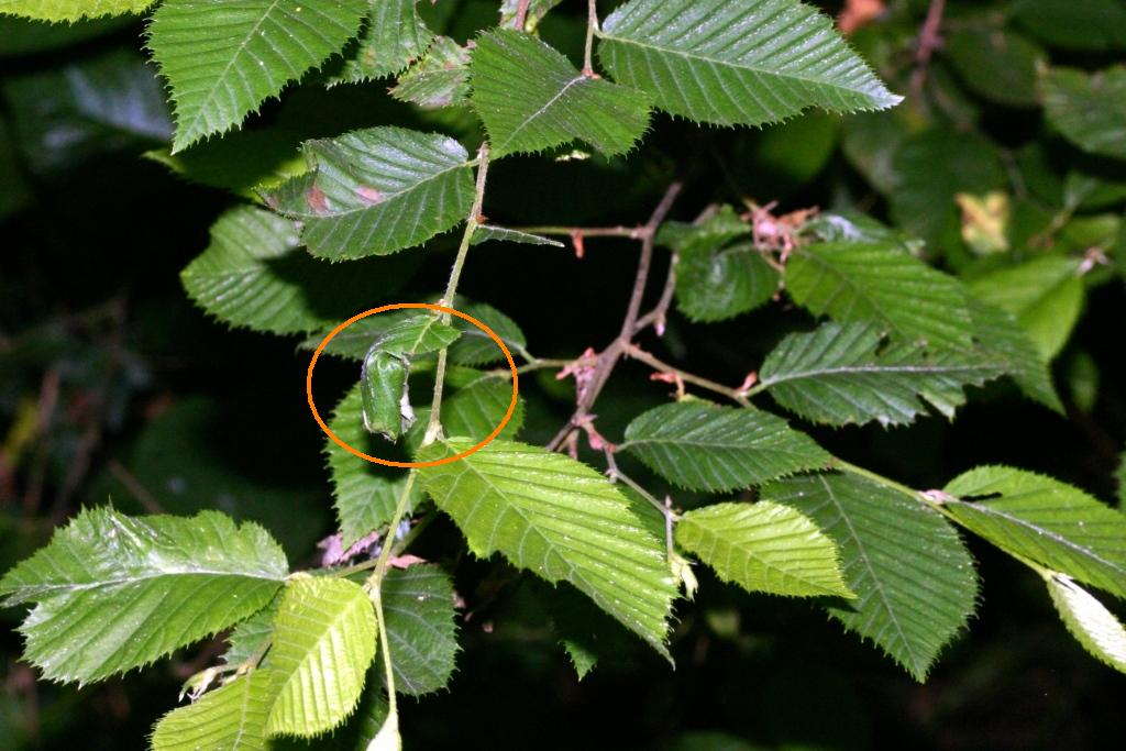 Un po' alla volta, con fatica, la foglia è ridotta ad un cilindro. In questa fase, anche se non l'ho mai fotografata con precisione, avviene la deposizione dell'uovo (talvolta sono due). La femmina si porta in una parte del lembo interna al rotolo che sta costruendo ed inserisce le uova. Poi riprende ad arrotolare. Il cilindro ha assunto la sua forma quasi definitiva