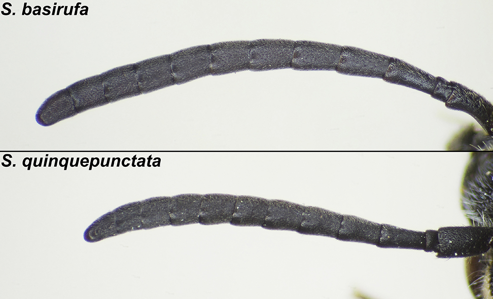 Come già accennato, la nuova Sapyga basirufa è estremamente affine a S. quinquepunctata e le due specie sono differenziabili solo con un attento esame. Le femmine di Sapyga basirufa hanno normalmente i primi due tergiti rossi e i seguenti quattro neri con macchie bianche, ma andando verso la Turchia centro-occidentale si passa gradualmente verso una colorazione con tre tergiti rossi e tre neri con macchie, come si osserva in S. quinquepunctata, ma in tal caso viene in aiuto l'unico carattere morfologico costante: la lunghezza di flagello e flagellomeri. In S. basirufa infatti il flagello è nettamente più lungo, con tutti i flagellomeri più lunghi che larghi, similmente a come si osserva in S. similis, mentre in S. quinquepunctata i flagellomeri 5-9 sono subquadrati o anche più larghi che lunghi.