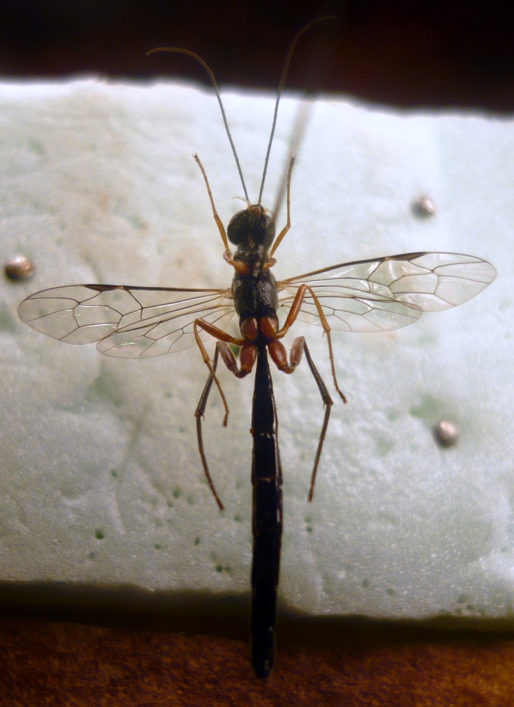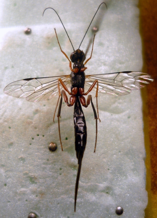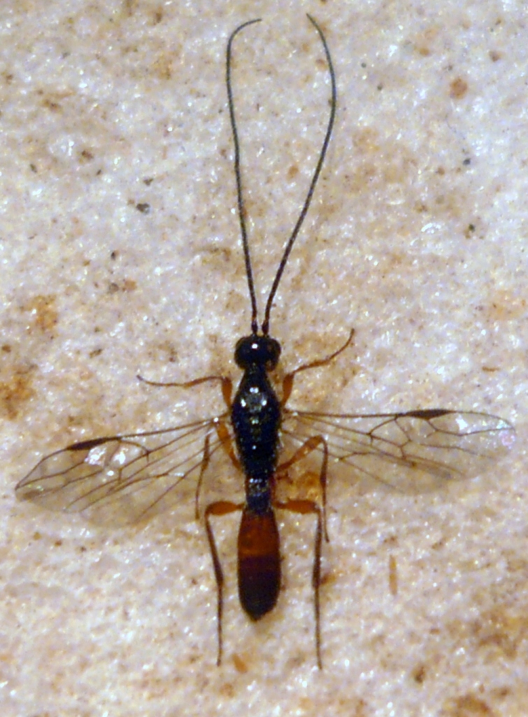 La prima specie, come già detto, è Deuteroxorides elevator (Panzer, 1799) (= albitarsus (Gravenhorst)), ovviamente una femmina. Si può notare l'assenza di rugosità dietro gli occhi. Da quel che leggo tra le mie carte, parassitoidizza Prionus coriarus, Leiopus nebulosus, Molorchus minor, Aromia moschata e Kolarov riporta anche un curculionide, Ropalomesites tardyi.