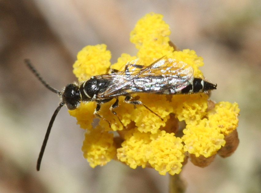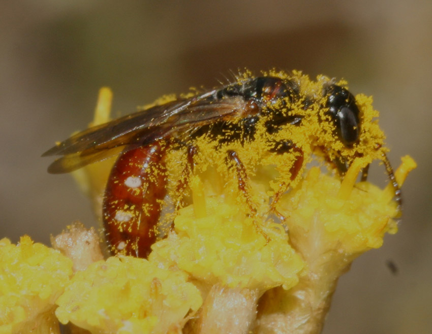 Ciao Roberto, da frequentatori delle dune di Porto Ferro le nostre osservazioni spesso si sovrappongono. Bellissimo, anzi bellissima! L’ho fotografata e catturata la scorsa estate nello stesso sito sui fiori di elicriso, ho lavorato su di essa per settimane prima di arrivare alla determinazione, si tratta di una femmina di Meria tripunctata, quello che mi faceva impazzire e mi metteva fuori strada é l’incredibile dismorfismo sessuale. Passi l’aspetto generale e la colorazione ma anche la nervatura alare é completamente differente da quella del maschio. A questo aggiungiamo che non esistono foto di riferimento e che i soggetti residenti in Sardegna e Corsica hanno l’addome rosso a differenza di quelli continentali che l’hanno nero. Avevo postato il maschio sul forum “le monde des insectes” ma nessuno specialista mi ha saputo dare aiuto fino a quando Mario Boni Bartalucci ha visto per caso il mio post ed ha fornito la diagnosi attraverso una mail all’amministratore della galleria. La determinazione della femmina é stata molto più complicata, anche in questo caso nessuno specialista é stato in grado di aiutarmi (non sono riuscito a contattare Mario Boni Bartalucci) ma mi é venuta incontro la vecchia “Faune de France” dove ho trovato (sotto il vecchio nome di Myzine tripunctata) una descrizione perfettamente coincidente con tanto di nervatura alare e varietà insulare (la vecchia Myzine erythrura di Costa). Se sei d’accordo stasera posso aggiungere la foto del maschio e della femmina in habitat.