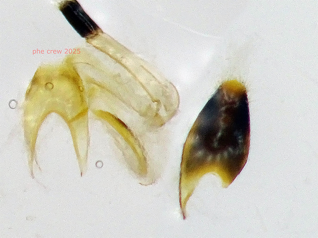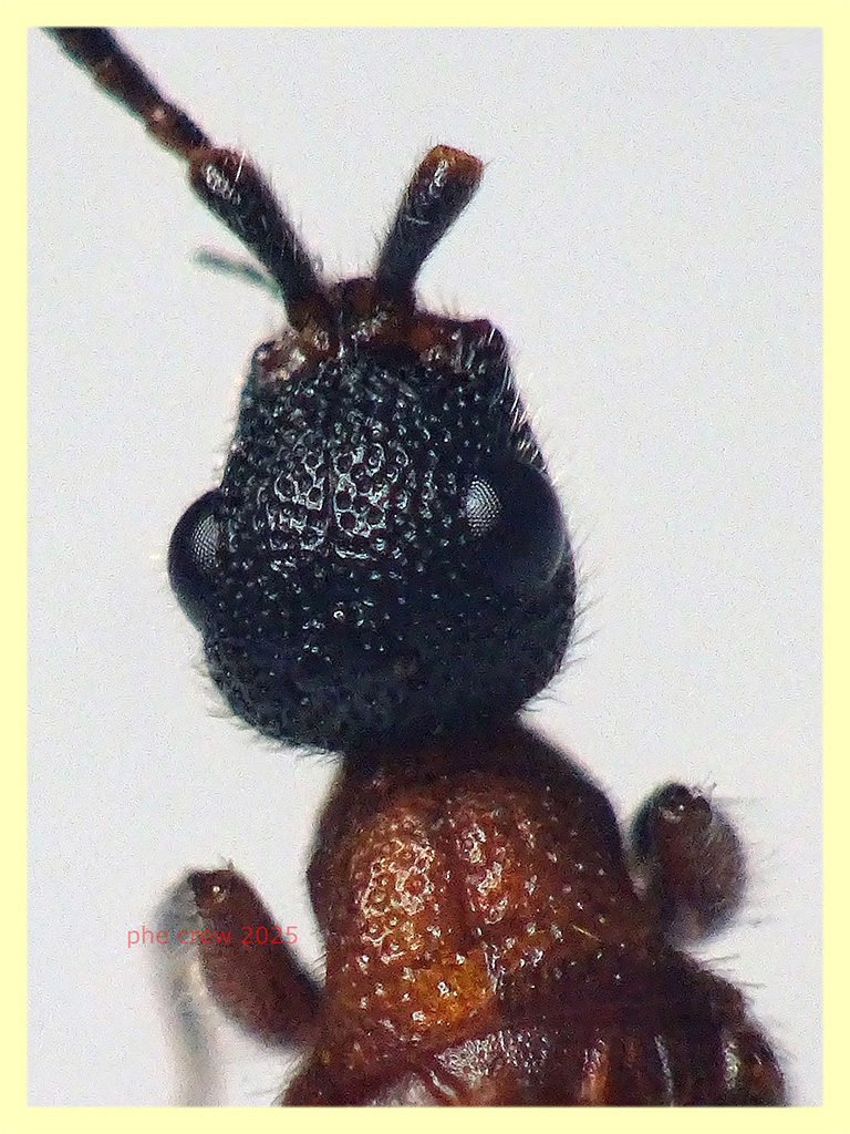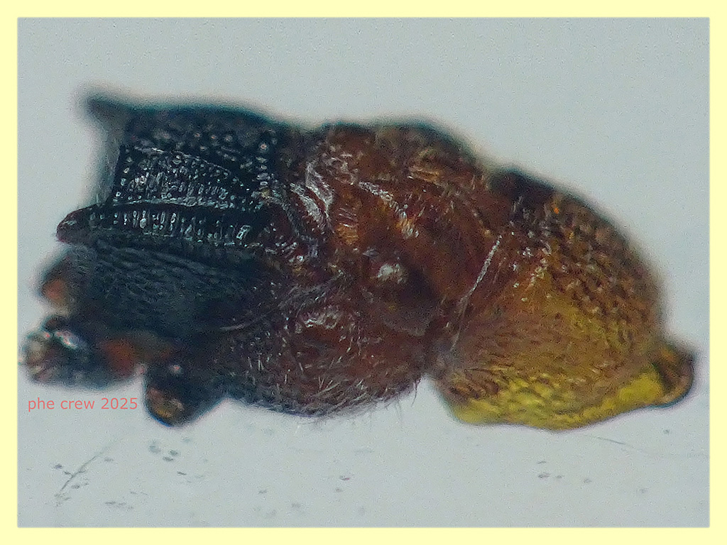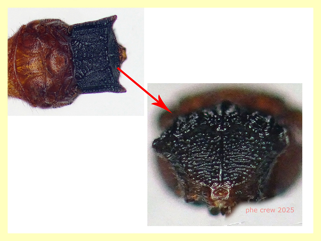 ....purtroppo non credo si possa andare piu' avanti di cosi', ho anche cercato di fotografare l' hypopygium...ma l' ho inesorabilmente distrutto. E' una femmina al 100 % ho visto l' aculeo al macro. Sono convinto percio' che sia una femmina alata di Heterocoelia sp. ....daltronde cio che si vede mi porta a lei. Alcuni punti li ho gia' citati sopra....sono partito dagli ocelli ....secondo la mia ipotesi iniziale con l' ocello anteriore internamente alla linea (fig. 19) ci sono le specie Sulcomesitius sp. e Hamusmus sp. , ma le femmine di questi sono testa, torace e propodeo rosso per la prima, corpo tutto nero per la seconda. Con l' ocello esterno (fig. 20) anche se dovessi inclinare per sbaglio non ci arriverebbe mai in quella posizione, invece per quello frontale (fig. 22) e' abbondantemente in avanti per confondersi ....quindi li ho scartati a priori. Rimane la fig. 21 dove inclinando leggermente il mio soggetto la linea immaginaria taglia perfettamente in due l' ocello anteriore. Nel pdf di Argaman 2003 con la figura 21 abbiamo le seguenti specie: Heterocoelia sp., Gerbekas sp., Botoryan sp. e Pycnomesitius sp.. Di queste specie citate pero' solo Heterocoelia sp. e Gerbekas sp. si trovano nel Paleartico (letto nel pdf di Barbosa, Hermes, Lepeco del 2022) e posso sicuramente inserire la mia femmina tra le Heterocoelia sp. che hanno mesoscutum rosso mentre le femmine di Gerbekas sp. lo hanno nero. ....se qualcuno vuole convalidare o smentire i miei scritti sono ben accetti ! ....le ultime foto