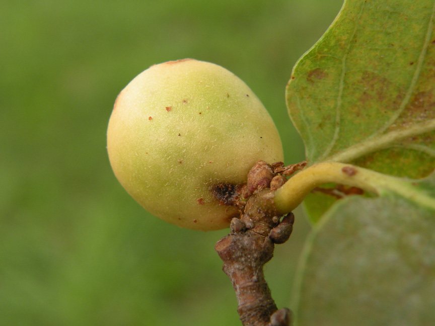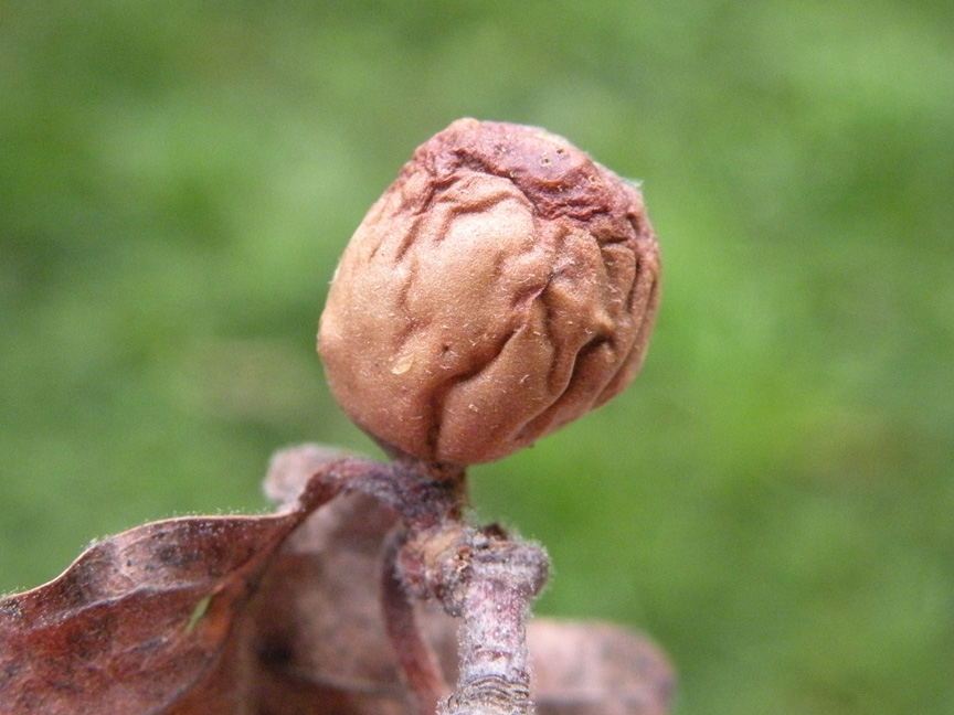 finalmente la misteriosa galla a “forma di pera” :hp: Si tratta di Andricus gallaetinctoriae (Olivier 1791), bel cecidio che nell’età giovanile si presenta morbida e quasi succulenta, con la maturazione assume colorazione marroncina e consistenza legnosa. Come accenni tu, la galla verosimilmente ha avuto sviluppo atipico, forse tardivo, e al perire della larva si è afflosciata. Prova a sezionarla, magari si trova qualche simpatico inquilino, che se richiudi nella sua camera procede con lo sviluppo.