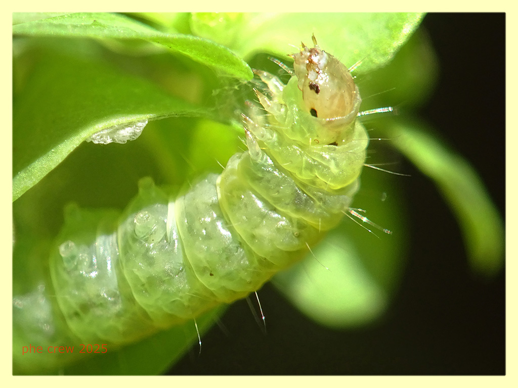 ....questa e' la larva tirata fuori dalle foglie aggrovigliate e tenute insieme da fili di seta che usava come tana. - 22.8.2025.