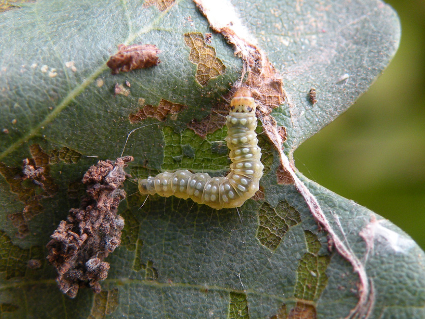 Si tratta di un microlepidottero le cui dimensioni non superano il centimetro. La larva sembra parassitare piante di quercia, faggio e melo. Credo di averla trovata sulla Farnia (Quercus robur L.s.l. ), così come tutte quelle che ho trovato e non sulla Rovere, come indicato in qualche testo. Ha trascorso l’inverno allo stato larvale: nel mese di gennaio non si era ancora trasformata in crisalide! Avevo dei dubbi sulla possibilità che ciò avvenisse, pertanto lo sfarfallamento è stata per me una gradita sorpresa.
