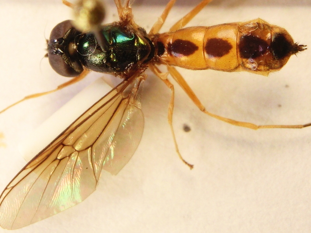 Sargus sp. femmina. Per l'ala ialina possiamo escludere cuprarius, che io sappia l'addome più o meno colorato di rosso o arancio è una caratteristica delle femmine di S. bipunctatus ma non ho chiavi affidabili. |
