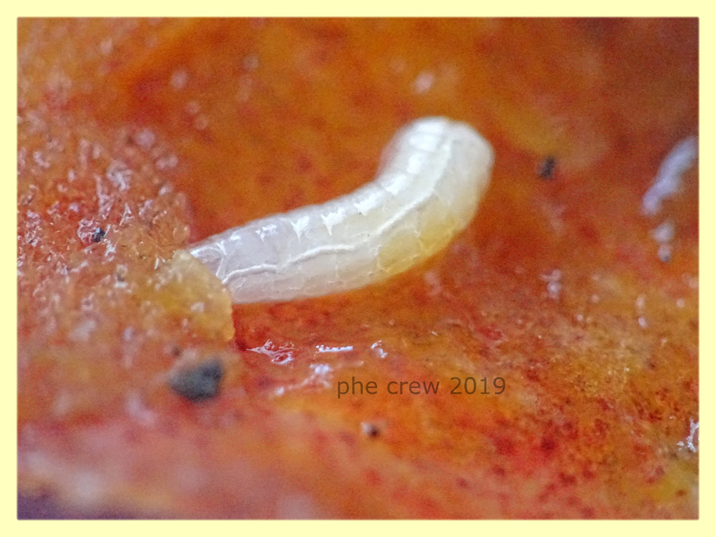 ...trovate in una Pesca due larvette di 2 mm. e allevate. La cosa buffa è che se tirate fuori dalla loro zona umida si acciambellato e saltano via (come in foto 5)... finché non ritornano in una zona a loro gradita.... sicuramente su di un'altra Pesca caduta li vicino. Ho fatto anche un video della larva saltante ma mi sa che sul forum non si può postare. ![]() |