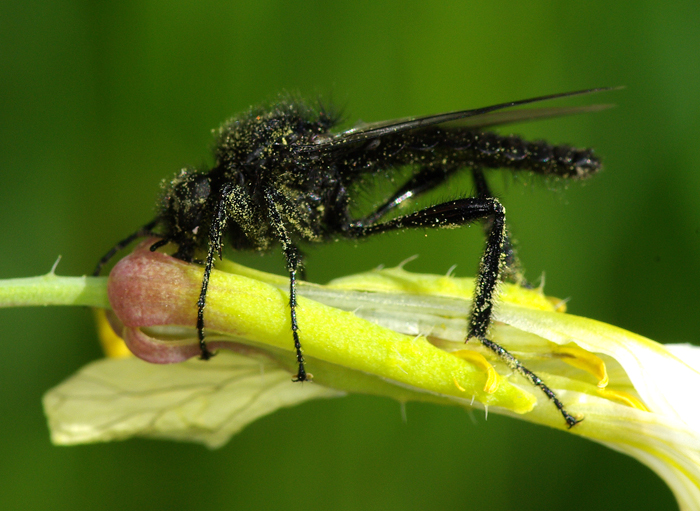 Per quanto riguarda questi Diptera neri brancolo nel buio. Non riesco a trovare neanche la famiglia. Assomigliano ad alcuni Syrphidae dei generi Cheilosia o Xylota, ma non lo sono, almeno non delle specie di cui ho trovato qualcosa, per cui una identificazione almeno della famiglia sarebbe già qualcosa. Sono comunissimi in Sardegna a primavera: Le prime due foto sono fatte a Bade Salighes il 01.05.10, la terza ad Oschiri il 06.03.10. |