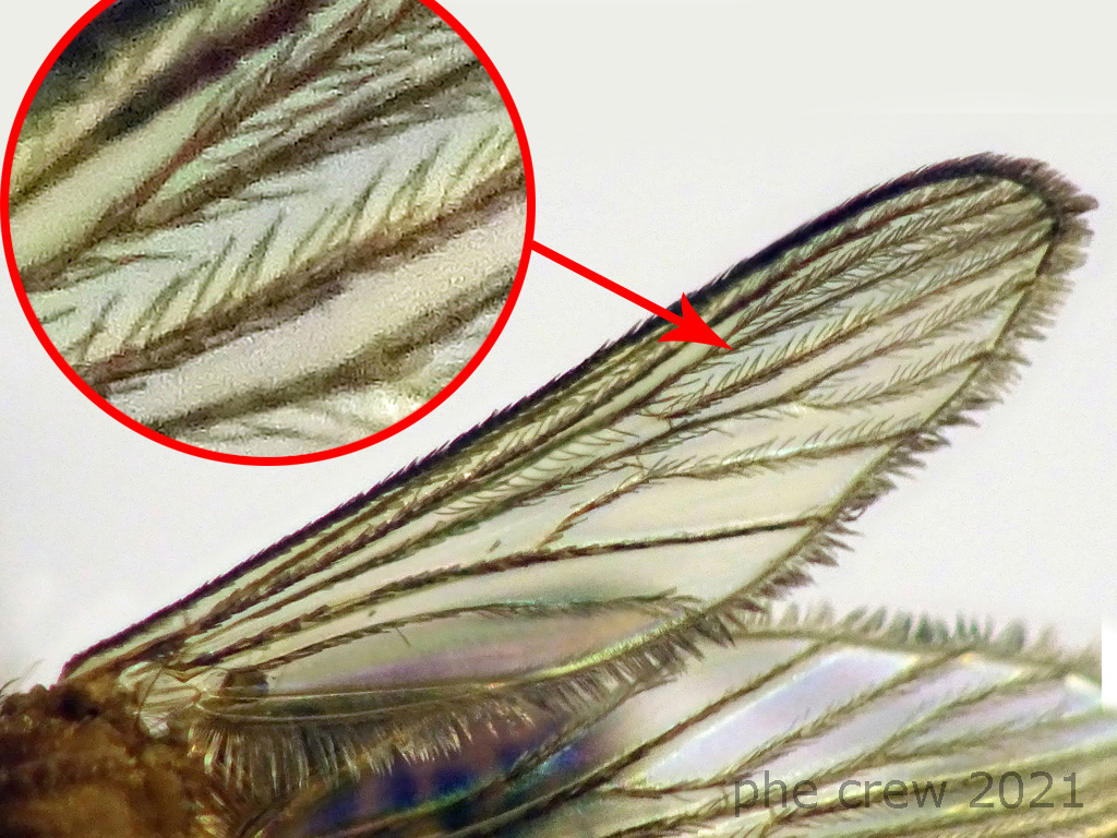 Seconda cellula alare marginale di lunghezza uguale o maggiore della propria asta. Purtroppo la venulazione non si nota benissimo. Linea di congiunzione tra l'apice della nervatura anale, la seconda biforcazione della radiale e la prima biforcazione della cubitale formante una linea spezzata. Ali con nervatura anale non piegata ad angolo retto Per fortuna il carattere diagnostico per Culex sp. sembra combaciare.