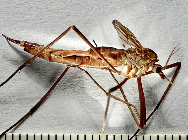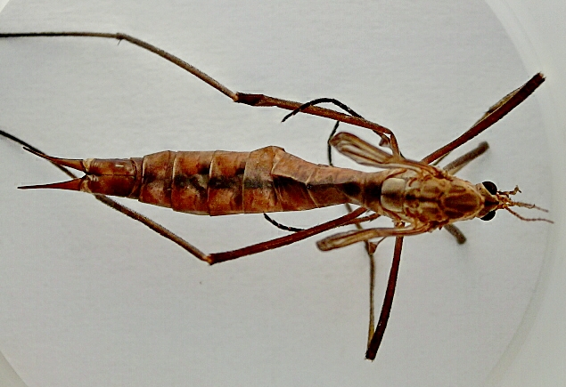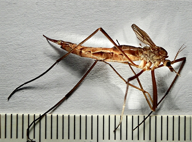 I Tipulidae non sono una famiglia banale; tra questi in particolare il genere Tipula conta svariati sottogeneri e, per la sola fauna italiana, oltre centosettanta specie. In compenso io non sono riuscito a trovare in rete delle chiavi da cui poter incominciare a capirci qualcosa, comunque cercare di capirci qualcosa solo con le chiavi e delle foto è una impresa velleitaria. In questa situazione meglio fermarsi a Tipula sp. salvo aggiungere, questo senza ombra di dubbio, che è femmina.