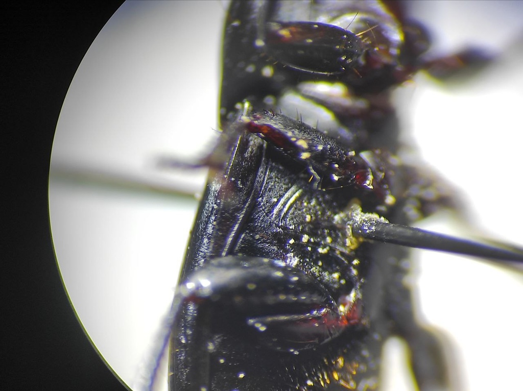 Il mio esemplare ha 6 pori setigeri sul margine posteriore del femore posteriore (5 con setola annessa e uno senza) e non presenta peluria sugli ultimi 2 sterniti, ad eccezione della coppia di setole tipiche.