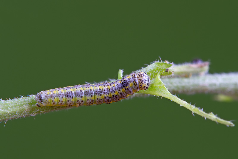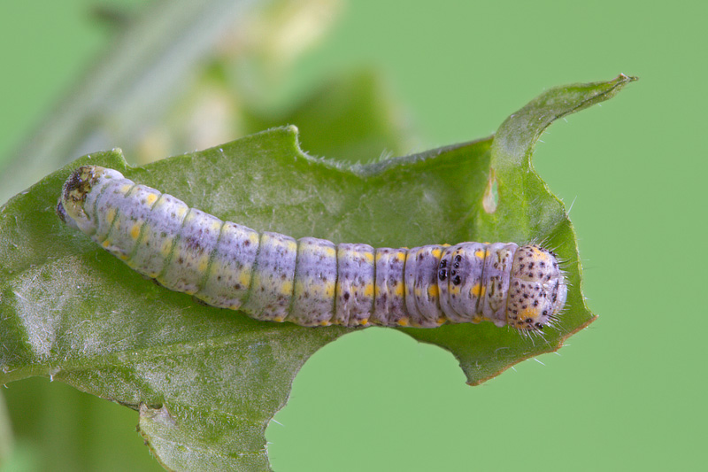 Ciao, ho trovato questo bruco il 01 Giugno 2013 su Sisymbrium officinale. L'ho portato a casa per allevarlo e dopo un paio di mute purtroppo oggi è morto senza alcun motivo visibile, quando era giunto a circa 2 cm di lunghezza.