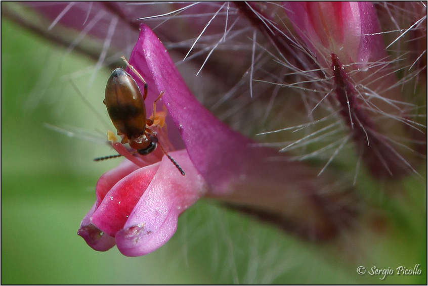 Archiviando foto di fiori di Trifolium rubens ho notato che in un fiore alla base dell'infiorescenza era presente un insetto che per le sue piccole dimensioni non avevo osservato. Essendo abbastanza nitido ho provato ad isolare il particolare e andando alla ricerca per immagini ho trovato una buona somiglianza con il coleottero Anthicidae Microhoria fasciata. Potrebbe essere?
