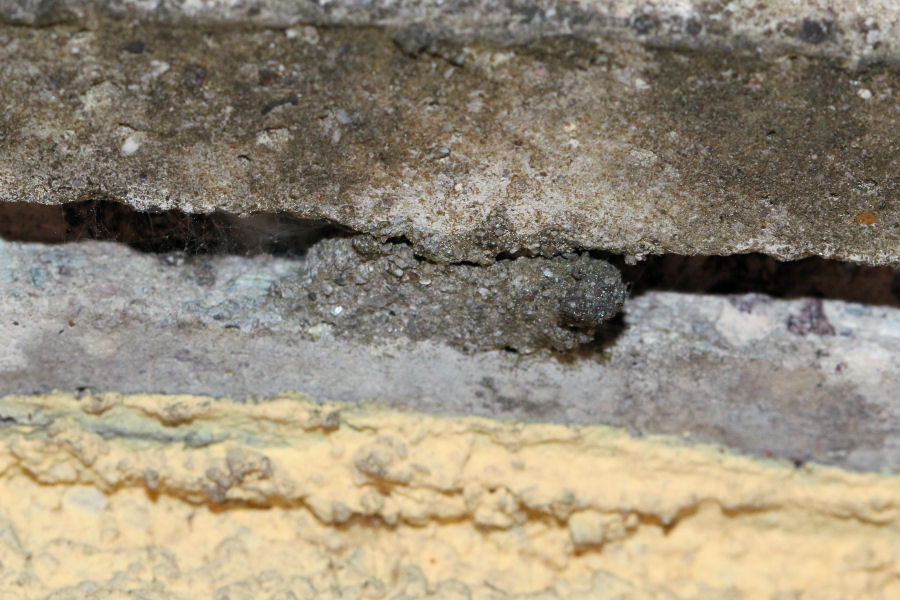 vi chiedo aiuto per identificare un Eumenide osservato sul terrazzo. In realtà avevo visto, nascosto nella canalina sottostante la copertura in cemento del bordo del terrazzo, una forma dello stesso colore del cemento e lunga circa un centimetro e mezzo. Tastandola si è rotta la parete esterna e sono apparsi diversi piccoli bruchetti, tutti aggrovigliati e vivi.