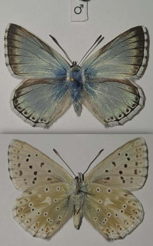 La Lysandra coridon (Poda, 1761) o anche Polyommatus coridon è un lepidottero diurno appartenente alla famiglia dei Lycaenidae e sottofamiglia Polyommatinae. La sua distribuzione, limitata alle praterie calcaree e gessose d'Europa centro-meridionale tra i 100 e i 2.000 metri di quota, riflette una storia evolutiva legata ai rifugi glaciali mediterranei. Dopo l'ultima glaciazione, la specie si espanse dai Balcani e dall'Italia lungo due rotte principali, una settentrionale verso l'Europa centrale e una alpina attraverso le Prealpi, generando popolazioni geneticamente distinte, oggi separate da barriere geografiche come i Carpazi. È opportuno ricordare che una limitata variabilità nel numero dei cromosomi non è indicativa di speciazione: esperimenti dimostrano che l'incrocio di individui appartenenti a popolazioni che hanno un numero di cromosomi leggermente diverso accade con facilità e produce una discendenza fertile; il processo di fecondazione (fusione dei gameti) implica l'incrocio di elementi cromosomici, con esclusione delle componenti sovranumerarie. Sebbene sembri che parte dell'informazione genetica vada necessariamente perduta in questo processo, l'incrocio cromosomico durante la fecondazione probabilmente non è casuale, e questo suggerisce che, se ci sono perdite, queste sono selettive e di piccola o nulla conseguenza materiale, come dimostra la vitalità della progenie. È noto che per molte specie, molti geni portati dai cromosomi sono essenzialmente ridondanti, persistendo solo come un'eredità della storia evolutiva, come per la Lysandra coridon Poda. Il maschio di Lysandra coridon ha come colore di fondo nella psa molto variabile localmente e/o regionalmente che verte sul blu-giallastro molto tenue. Nelle Alpi Giulie il maschio, nella psa ha decisamente più blu della forma nominale e senza riflessi giallastri. In Grecia il maschio, nella psa risulta più opaco, di colore blu-grigiastro con riflessi giallastri; una forma simile è presente sugli Appennini, come quelle nelle foto presenti. Anche il colore di fondo della pia e lo sviluppo dei disegni variano da regione a regione, con forme più chiare e dai disegni meno marcati predominanti nelle regioni mediterranee. Le femmine nella psa sono di colore marrone con qualche sfumatura blu-petrolio, i vari gradi di sfumatura blu sono molto rari in gran parte delle popolazioni, ma frequenti in altre. Nelle ap della psa del maschio e nella femmina, rispettivamente alla fine degli spazi delle venature s6 (poco visibile) e nelle venature s5, s4, s3, s2 e nella venatura s1 troviamo una doppia macchia nera; nella femmina queste macchie sono bordate da una leggera sfumatura arancio. Le macchie nere sono situale nell’area sub marginale con sfumature nere; nell’area marginale è presente un bordo bianco sia nell’ap che nell’aa. Nelle ap della pia del maschio e della femmina troviamo delle macchie nere rispettivamente negli spazi delle venature s1b, s1, s6, s5 rispettivamente nell’area discale. Una macchia tipica della specie la troviamo nella pia dell’ap dalla venatura v6 alla venatura v4 convergendo in una macchia nera proprio nello spazio s4, sia nell’esemplare maschio che nell’esemplare femmina. Nell’area submarginale dell’aa e dell’ap sia nel maschio che nella femmina troviamo delle macchie nere marginali con delle mezzelune nere-arancio (nella femmina sfumature arancio più diffuse) come degli ocelli che si trovano rispettivamente in ogni spazio tra le venature. L’area basale della pia dell’esemplare maschio risulta più blu rispetto all’esemplare femmina. Gli esemplari femmina di L. coridon nella pia hanno colori più scuri, tendenti al marrone con sfumature giallastre. La Lysandra coridon (Poda, 1761) compie in media una generazione annua, nei mesi più caldi: intorno giugno-agosto, questo varia a seconda delle condizioni climatiche dell’annata e della località in cui si trova l’esemplare. Questa come specificato prima predilige ambienti secchi, cespugliosi, fioriti e con erba bassa, con terreni calcarei. Le analisi genetiche rivelano che le popolazioni italiane, derivate da antichi rifugi glaciali, conservano una diversità allelica cruciale per il rafforzamento delle popolazioni nord-europee, sottolineando l'importanza di strategie transnazionali nella conservazione. Fenologicamente, i cambiamenti climatici stanno anticipando lo sfarfallamento a giugno nelle regioni meridionali, con impatti ancora non del tutto compresi sulla sincronia tra ciclo larvale e disponibilità della pianta ospite. Il ciclo vitale del Polyommatus coridon è strettamente legato a Hippocrepis comosa, pianta ospite esclusiva delle larve, e a formiche del genere Myrmica, Lasius e Formica, con cui instaura una simbiosi obbligata. Le larve secernono sostanze zuccherine da ghiandole specializzate (ghiandole di Newcomer) per attirare le formiche, ricevendo in cambio protezione dai parassitoidi. Questo rapporto mutualistico, unito alla monofagia estrema, rende la specie particolarmente sensibile alle alterazioni ambientali. L'abbandono del pascolo estensivo, l'eutrofizzazione dei suoli e la frammentazione degli habitat stanno causando un declino sia delle popolazioni di farfalle che delle formiche simbionti, con effetti a cascata sull'intero ecosistema. I maschi utilizzano superfici rocciose per il basking, raggiungendo temperature toraciche di 30-35°C necessarie per il volo nuziale, mentre le femmine adottano strategie criptiche durante l'ovideposizione, posizionando uova singole alla base delle foglie basali per evitare predatori. La pigmentazione delle ali, ricca di cristalli di guanina, svolge un duplice ruolo nella termoregolazione e nella comunicazione visiva tramite riflessi UV. Molte sottospecie, sempre univoltine di Lysandra coridon possono subire notevoli variazioni cromatiche che possono cambiare di molto le intensità cromatiche; nel nord della Grecia troviamo alcune sottospecie che subiscono notevoli variazio