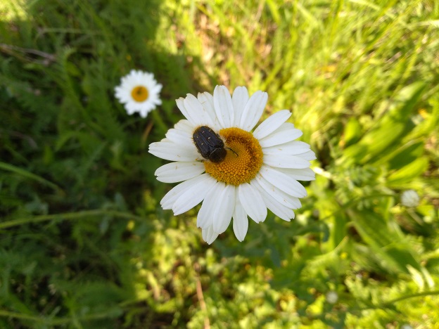 Rinfrancati dalla bellezza di cotanti merdaioli, continuiamo a spulciare fiori ed erbe, trovando ancora Elateridi e poco altro. Finalmente, dopo un paio di tentativi falliti, Nicolai becca un’Anthaxia su una margheritona. Rimaniamo entrambi colpiti dalla presenza di certi Carabidi dal pronoto ceruleo (credo Poecilus) che se ne stanno a penzoloni sulle spighe, in bella vista; se non ricordo male dovrebbero nutrirsi di semi.
